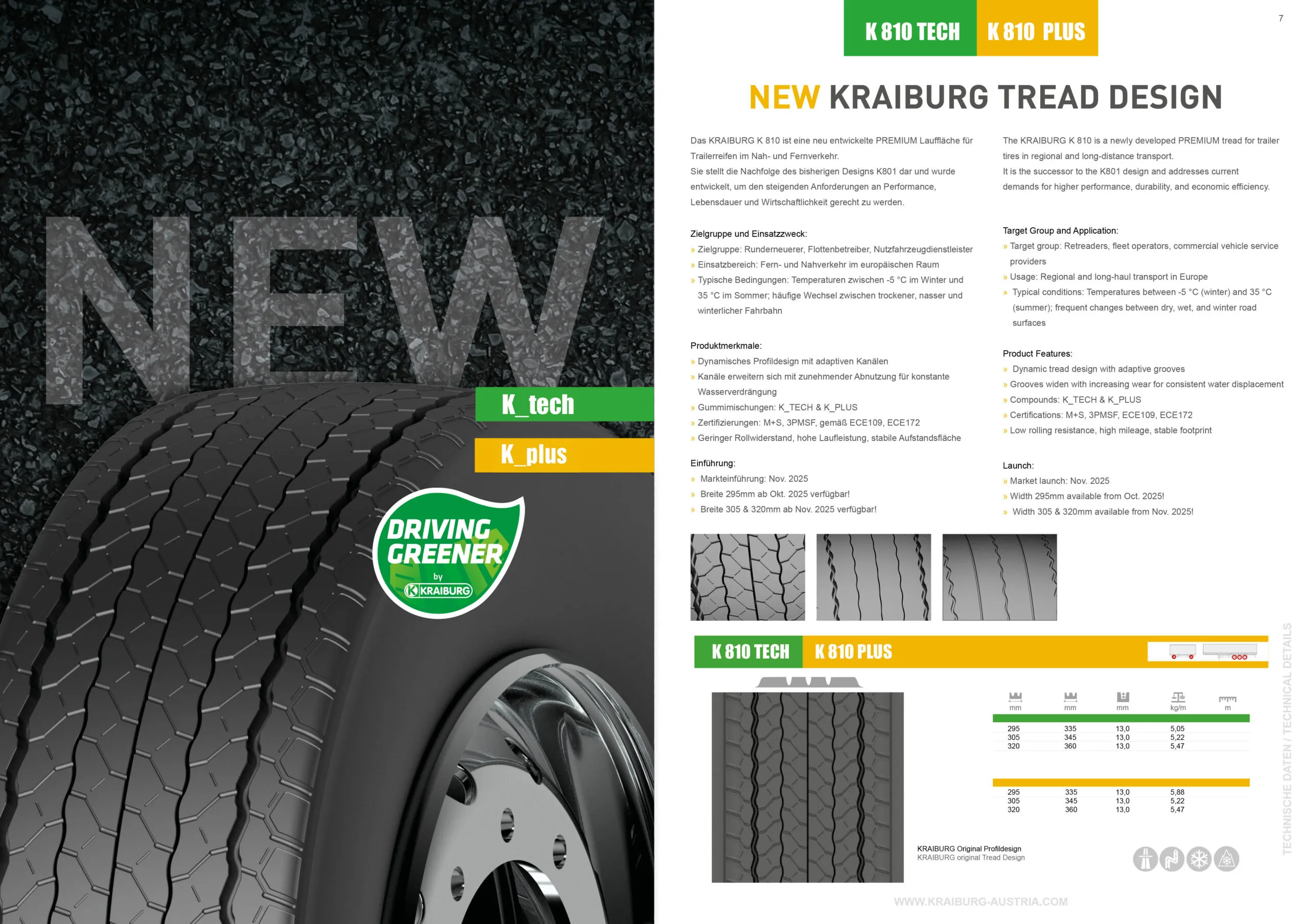 There is also news about the proven K 704 – a design that scores with a closed shoulder and low tread depth. It is also flexible in use: on buses, in local public transport and in regional freight transport. The tread pattern is now available in 240 mm in addition to 250 mm. “With our new tread design range, we are once again underlining our commitment to supporting retreading partners with practical solutions and clearly structured information,” says Christoph Priewasser, Head of Marketing and Service at KRAIBURG Austria. “With this in mind, we wish everyone a successful autumn business season, in line with our motto ‘Drive it. Again.”