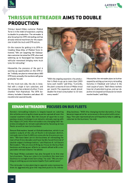 THRISSUR RETREADER AIMS TO DOUBLE PRODUCTION Thrissur based Midas customer Plakkat Tyres is in the midst of expansion, aspiring to double its production. The retreader is also foraying into OTR retreading and has already ordered machinery for the expan- sion in both the truck and OTR sectors. On the reasons for getting in to OTR re- treading Shaju Shiju of Plakkat Tyres in- formed, “We are targeting the Vallarpa- dam container terminal for OTR, also road widening up to Kasaragod has improved vehicular movement bringing more truck tyres for retreading.” Meanwhile, the presence of the port is opening up opportunities on the OTR si- de. “Initially, we plan to retread about 600 OTR tyres annually, the numbers will grow gradually,” he said. On the truck tyre side, the site is insta- lled with a single 6 tyre autoclave, and the company has ordered a further 7-tyre chamber from Rajmahaal. The OTR ma- chinery includes 6 bonders and about 40 moulds to be sourced locally. LATEST NEWS - INDIA “With the ongoing expansion, the produc- tion is likely to go up to more than 2,000 tyres each month,” said Shiju. “Currently, the plant consumes 8 tons of Midas tread per month The expansion would almost double the tread consumption to 15 tons every month.” Meanwhile, the retreader plans to further expand by setting-up two more retreading factories in Palakkad and Calicut in the next couple of years. “Both these markets have lot of potential to grow, and our ob- jective is to expand continuously to remain market leader,” said Shiju. EENAM RETREADERS FOCUSES ON BUS FLEETS Kerala’s retreading industry is largely based on catering the vehicles servicing the stone quarries spread all over the coastal southern state. But the closure of quarries is now posing a major challenge to an industry already coping with the impact of Covid. Now retreaders are changing their bu- siness strategies to remain operational by focusing on bus fleets as well as new tyre business. eastern suburb of the city of Kochi in Ernakulam district, retreads more than 3,600 tyre annually by the precure sys- tem. “We have been are in the business of retreading for more than three decades and have hardly faced this kind of double-edged challenge before,” said Paulose K J of Eenam Retreaders. “We are now shifting our focus to the bus fleet business and doing our efforts to remain afloat with a res- pectable retread volume,” he added. The loyal Midas customer has also forayed in to the new tyre business. “Now our plan is to transform the new tyre business to a single brand tyre shop,” he said. “We are wor- king on setting up an exclusive Apollo Tyre outlet soon.” The retreader is also planning to appoint sales representa- tives to aggressively give the required push to its retrea- ding business. “With the changing market dynamics, it has become imperative for us to move in the market with a stra- tegy. The sale representatives will hopefully help in adding volumes to the business,” he said. P.28