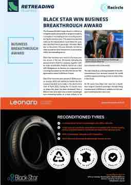 BUSINESS BREAKTHROUGH AWARD ai170774972790_LEONARD PUB JOURNAL 20 BLACK STAR WIN BUSINESS BREAKTHROUGH AWARD The Business Breakthrough Award is offered to recognise particular growth or progress made by a company in retreading or tyre recycling sectors during the previous year. This award was decided solely by the Nominations Committee this year, who selected French passenger retreader Black Star as the winner this year. Italmatic ran them a close second for their investments in automation within the retreading sector. Black Star has been very much in the news over the course of the last 18 months following the announcement that the company, together with its major shareholder, Mobivia, had struck a deal with Bridgestone to develop an integrated tyre recycling ecosystem on the site of the former Bri- dgestone tyre plant in Béthune, France. Black Star have now been present in Béthune sin- ce January 2022 and started to market the first Leonard branded tyres made in the plant at the start of April 2023. During the 15-month ramp seen anywhere else in the world. The plant stands as a shining example of how de- commissioned tyre factories around the world could be repurposed along circular economy lines in the future. At the same time Black Star now has a brand- new range of standard passenger retreads being manufactured in Béthune in addition to the com- pany’s existing factory near Lyon. Laurent Cabassu receives the Business Breakthrough Award on behalf of Black Star up phase the plant has been developed from a 240209 v2 vec copie.pdf 1 12/02/2024 15:55 defunct new tyre plant into a modern passenger tyre retreading facility of a kind unlikely to be