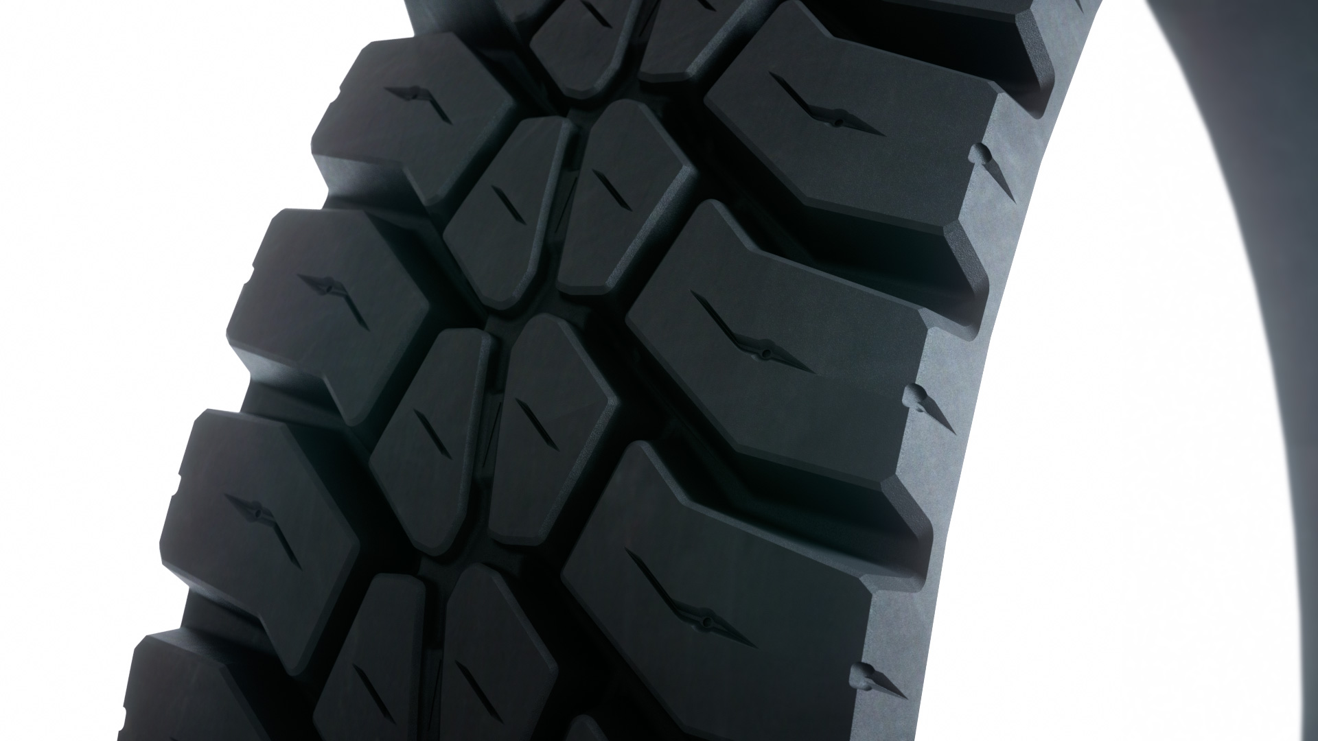 Blackline MIX202 is a drive design featuring a pattern with open shoulders and large transverse blocks, and a new and innovative ornamental sipe with a central hole on the shoulder’s block, ensuring a great look and a perfect cooling of the block during the service; this helps to minimise the heat generation, thus contributing to a longer casing and tread life.